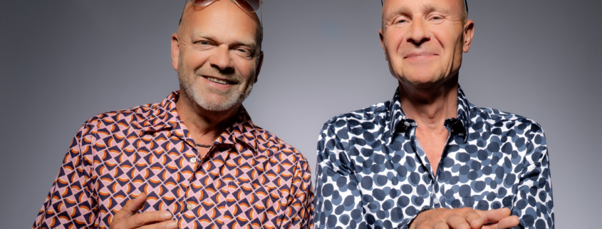 Ausgerüstet mit kleinen Saiteninstrumenten, Gitarren und viel Percussion schlagen die beiden